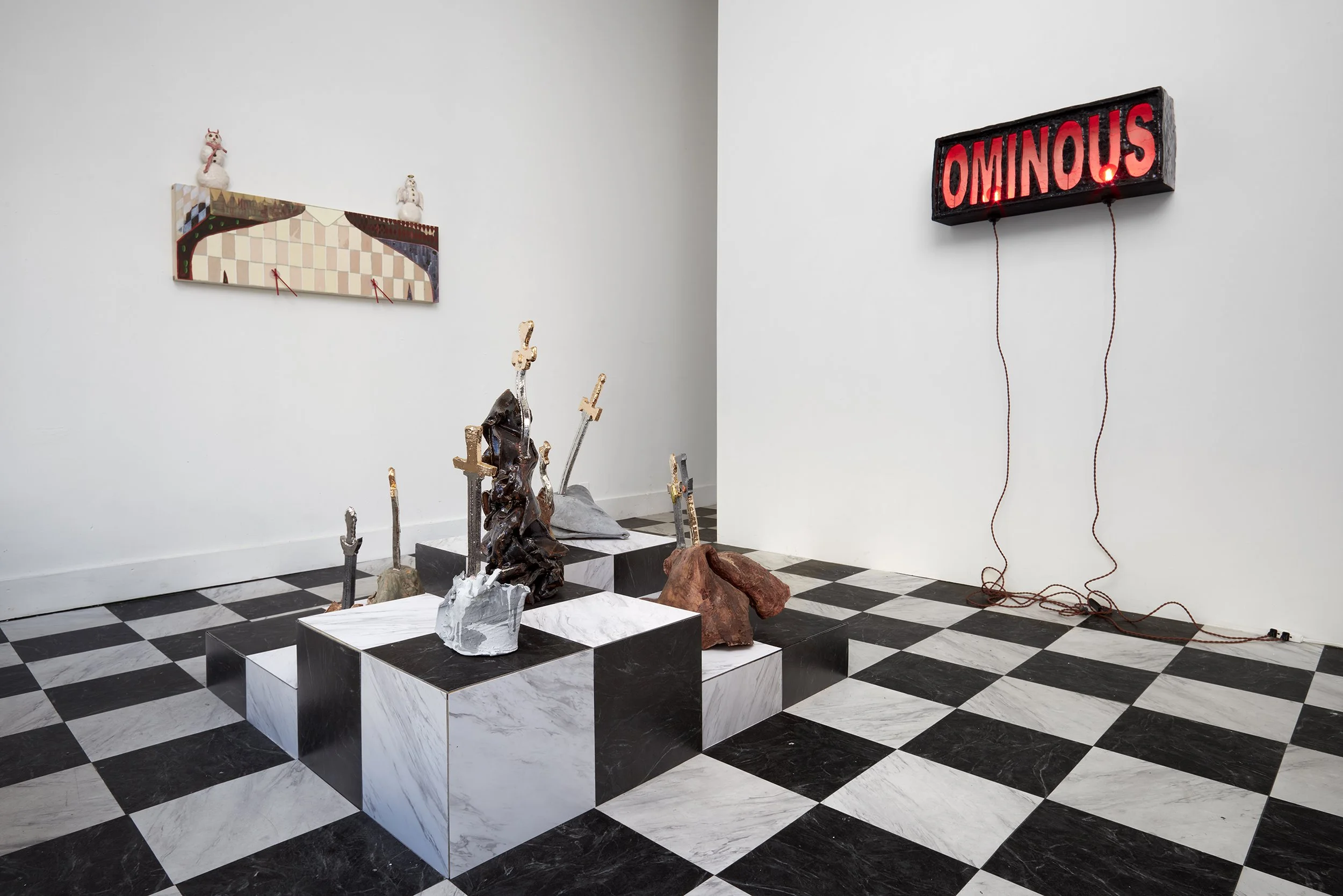 New Low is pleased to present Whole Ham, an exhibition by Los Angeles based artist Alex Kerr. Alex Kerr is equal parts fine artist and stage director - making scenes and props and actors for a twisted theatre that plays out backstage and in front of an audience. A troupe of repeating characters play the roles - troubadours, wizards, snowmen, jack-o-lanterns, spiders - all of whom are pathetic, bashful, and ashamed, some with a violent streak. Yet each figure is funny, inviting, sympathetic (when we first met, Kerr told me his work was about “gay sadness” - the pun was not lost on me). While decidedly dark, and sometimes sloppy, all of Kerr’s work reveals a clear confidence and joy (and mastery) in making - these works fuck. At the center of Whole Ham is a series of works titled Anything can be a rock. Nine ceramic sculptures, whose bases are culled from castoffs, his own and former classmates’, are each punctuated (penetrated) with a forged ceramic sword. They put the epic in epic fail, fantastically depicting the creative process, the plight of the artist, how does one become unstuck? Two new paintings flank the show. Perfect Pair depicts a bust, with clock nipples, a not so subtle reference to FGT and a reminder to “Be Here Now”. Two ceramic snowmen sit atop the work - one angel, one demon - two sides of one conscience, not battling, just chilling. Stupid shows a vase of flowers and a greeting card with the word “idiot” across the front. No matter if it's a sympathy card or a congratulations, it’s still sending love.In a corner leans Thunder, an eight foot saw with stars cut out. Aspirational in both scale and symbols, there’s more here about the artist’s toil, about editing, about a scene or work gone awry. Above it all, the word “OMINOUS” looms. Built in the style of an applause sign, this text, like Kerr’s cast of characters, begs for attention, mercy, and validation. Almost in the back of the gallery, Beautiful Mirror is one last study in contrasts - a beautifully hand-made, hand-held “mirror” projects an ugly face, flowers grow from the frame, it’s gilded in white gold. There’s something about a pep-talk here; I picture an actor backstage before the show, trying desperately to build up nerves - “I’m good enough, I’m smart enough, I’m going to slay…” Alex Kerr, (b. 1989, Norfolk, Virginia, USA) is a Sagittarius Sun, Taurus Moon, and Capricorn Rising. He received his BFA from Georgia State University (2015) and MFA from UCLA (2022). He lives and works in Los Angeles.
