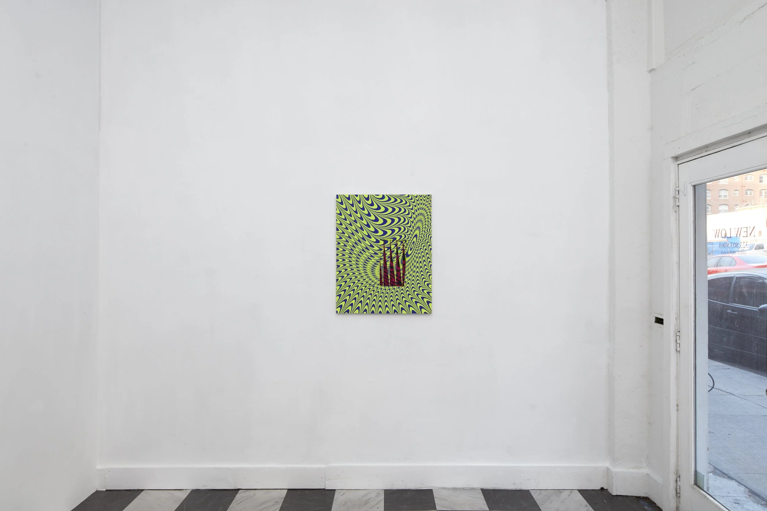 But over the last years, Houette has gone all-in on painting. Ever a contrarian, Houette’s commitment to painting appears as neither figurative nor expressionistic abstraction, but instead as hard-edged, psychedelic, geometric abstraction (read as: Op-Art). Where once a literal window might have appeared in her wall-hung rectangles, now a panel, akin to a children’s book, sits where moveable slats reveal another image, or pattern, or colour combination through this created interior space. In terms of a kinship with kids’ stuff, wonder remains, but naivité does not - they’re eerie, pointed, and often (literally) pretty twisted.