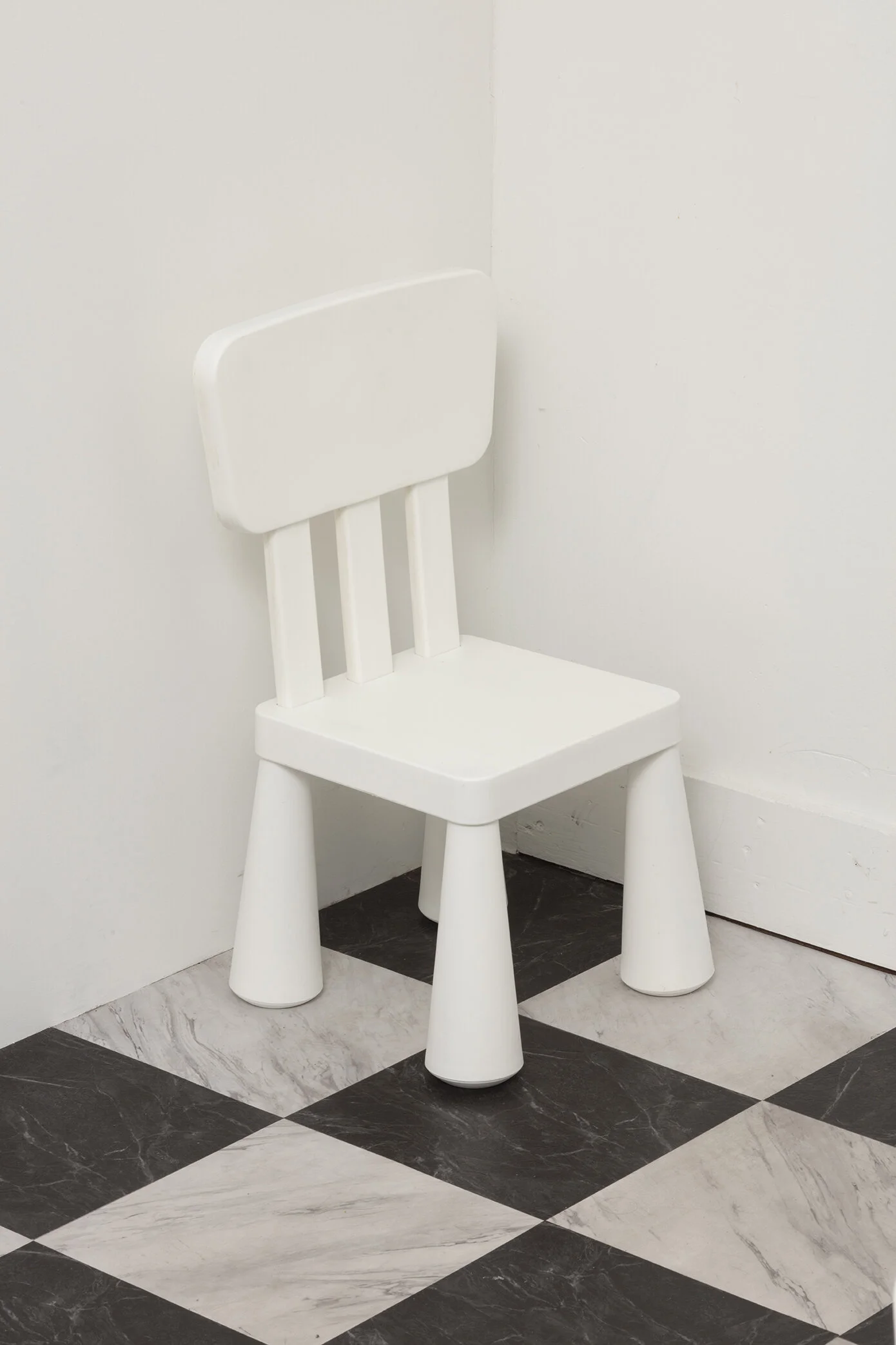 In the center of the space sits an empty, undersized table and chairs set. Here, in her postgrad debut, Schafer, who considers herself the “eternal art student-in-waiting” has custom cast one of the chairs, creating an imaginary place for herself in the “art world,” while also maintaining a perpetual spot at the kids’ table.